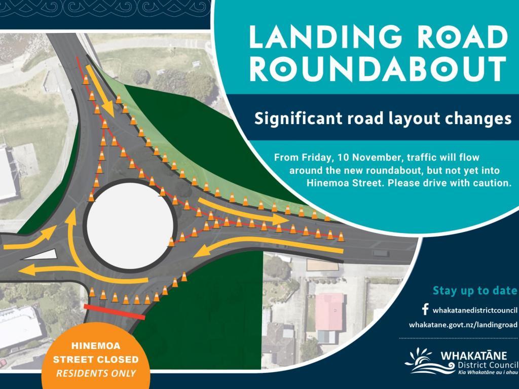 Whakatāne District Council is pleased to advise that from tomorrow (Friday, 10 November) traffic will flow around the new Landing Road roundabout, but not yet into Hinemoa Street.