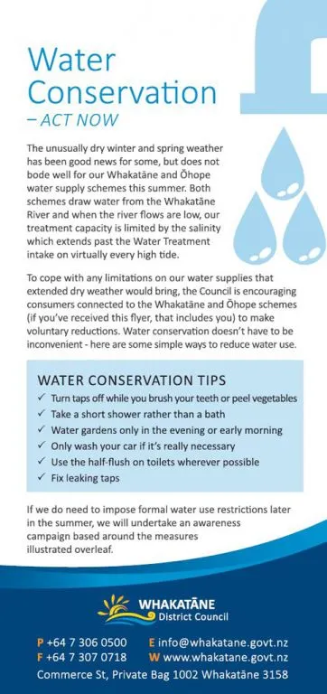 The Whakatāne District Council has launched a campaign aimed at raising awareness of the likely need for water conservation in Whakatāne and Ōhope.