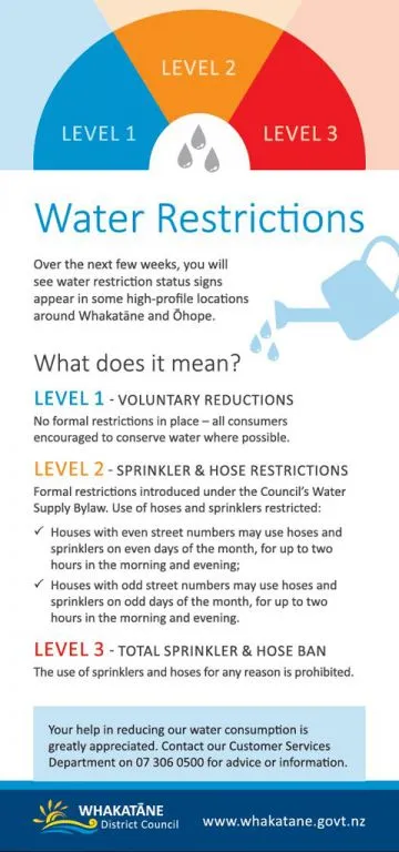 A leaflet indicating how the restrictions will work, if they are required, will be delivered with water rates invoices to all Whakatāne and Ōhope water consumers this week. It includes some simple tips for reducing household consumption, including: