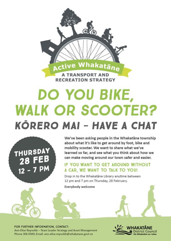 An initiative to investigate the ways that people are moving around the Whakatāne District is looking for feedback from people in the Whakatāne township at its drop-in session to be held at the Whakatāne Library from 12 – 7 pm on Thursday, 28 February.